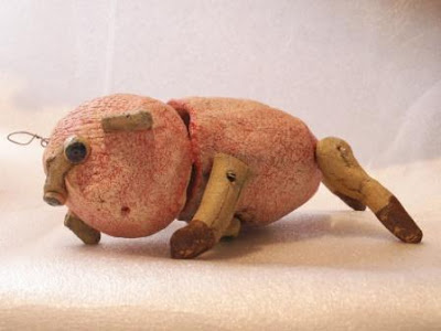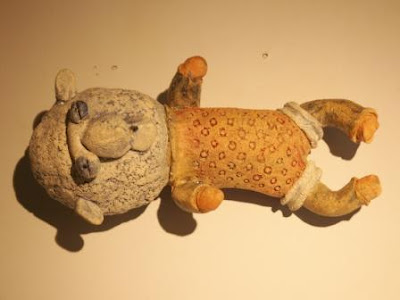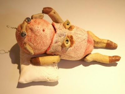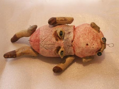 Esta peça foi inspirada nos brinquedos antigos feitos em folha de Flandres. É uma peça ligeiramente espalmada. Foi a primeira peça que fiz com este tipo de construção em que a cabeça tem um "apoio". Foi a peça percursora de muitas peças feitas para a exposição "Contos Paranormais" e posteriormente para a Bienal de Aveiro, na versão de pendurar na parede.