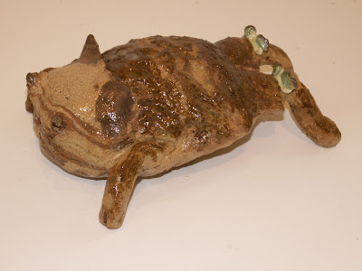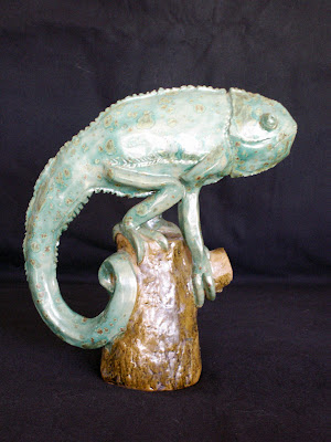 Quando comecei a fazer cerâmica experimentei várias coisas como a maior parte das pessoas em todas as actividades criativas. O primeiro camaleão equilibrava-se na boca de um pequeno pote. O segundo camaleão era praticamente igual a este mas maior. No caso destes dois camaleões a minha inexperiencia e pressa de fazer as coisas levaram a que o peso do camaleão em si fizessem abater um pouco a parte inferior da peça. Este é o terceiro camaleão que fiz e devo dizer para quem não sabe muito de cerâmica que o grande problema deste tipo de peças é a montagem.