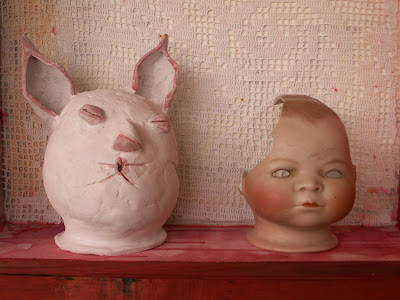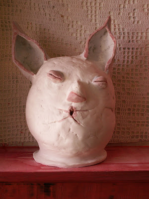 Esta cabeça de coelho está feita em porcelana, já vidrada em crú e à espera de ser cozida a 1220ºC. A cabeça partida foi a fonte de inspiração. No futuro será montada com o corpo antigo da própria cabeça partida e vai fazer parte de uma exposição que mais tarde ou mais cedo terá lugar no meu espaço expositivo e de trabalho em que vou combinar cerâmica antiga e as minhas obras de cerâmica. Desta exposição falerei mais tarde.
