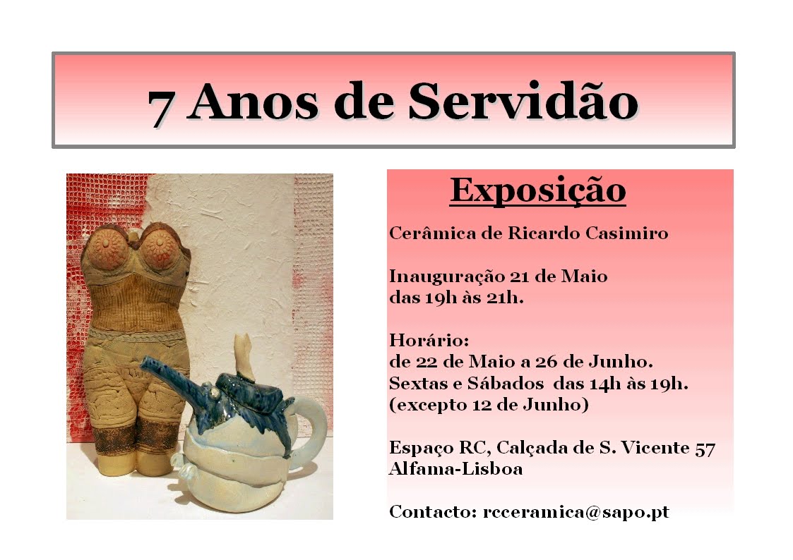 Convido-o/a estar presente na minha próxima exposição inspirada no poema de Luis Vaz de Camões "Sete anos de pastor Jacob servia..." Retrospectiva do atelier "Espaço RC". Apresentação de uma selecção de obras mais significativas, mostra da evolução e do percurso cerâmico do autor.